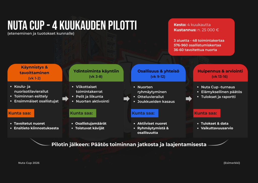 Nuta Cup on kunnille tarjottava valmis palvelu, jonka kunta voi hankkia nuorten aktivoimiseksi.